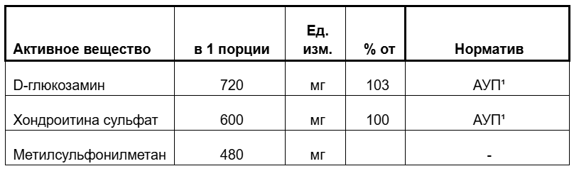 Глюкозамин с хондроитином и МСМ Пищевая ценность на 100 грамм продукта: белки – 1,1 г, жиры - 0 г, углеводы - 29,3 г. Энергетическая ценность на 100 грамм продукта: 509,1 кДж / 121,6 ккал *рекомендуемая суточная дозировка. ¹АУП - адекватный уровень потребления согласно приложению 5 «Единые санитарно-эпидемиологические и гигиенические требования к товарам, подлежащим санитарно-эпидемиологическому надзору» / не превышает верхний допустимый уровень потребления.