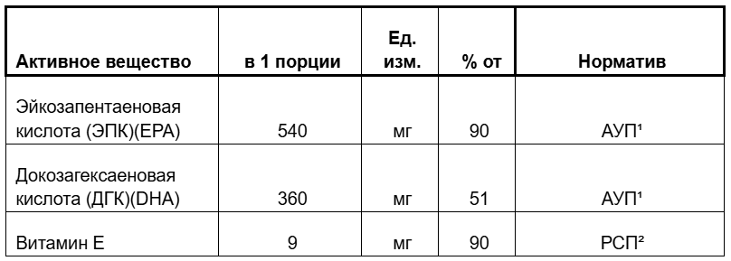 Омега-3 Пищевая ценность на 100 грамм продукта: белки – 14,8 г, жиры - 74,1 г, углеводы - 7,4 г. Энергетическая ценность на 100 грамм продукта: 3 164 кДж / 755,7 ккал *рекомендуемая суточная дозировка. ¹АУП - адекватный уровень потребления согласно приложению 5 «Единые санитарно-эпидемиологические и гигиенические требования к товарам, подлежащим санитарно-эпидемиологическому надзору». ²РСП - рекомендуемое суточное потребление согласно приложению 2 ТР ТС 022/2011 «Пищевая продукция в части ее маркировки».