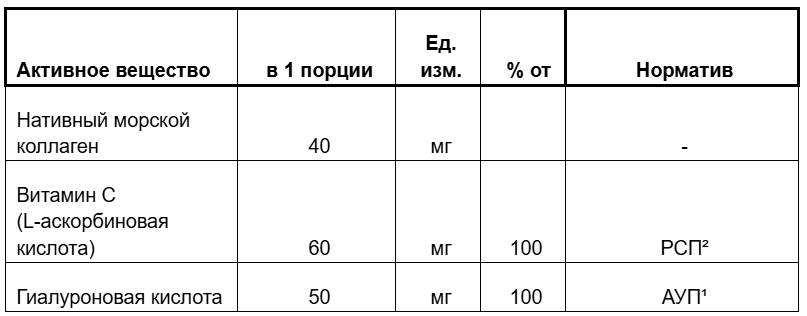 Нативный морской коллаген с гиалуроновой кислотой и витамином С Пищевая ценность на 100 грамм продукта: белки – 25 г, жиры - 0,1 г, углеводы - 8 г. Энергетическая ценность на 100 грамм продукта: 557 кДж / 133 ккал *рекомендуемая суточная дозировка. ¹АУП - адекватный уровень потребления согласно приложению 5 «Единые санитарно-эпидемиологические и гигиенические требования к товарам, подлежащим санитарно-эпидемиологическому надзору». ²РСП - рекомендуемое суточное потребление согласно приложению 2 ТР ТС 022/2011 «Пищевая продукция в части ее маркировки».