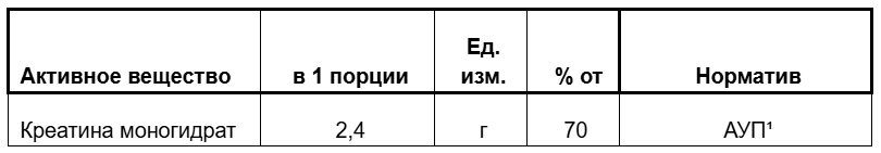 Креатина моногидрат Пищевая ценность на 100 грамм продукта: белки – 0 г, жиры - 0 г, углеводы - 0 г. Энергетическая ценность на 100 грамм продукта: 0 кДж / 0 ккал *рекомендуемая суточная дозировка. ¹АУП - адекватный уровень потребления согласно приложению 5 «Единые санитарно-эпидемиологические и гигиенические требования к товарам, подлежащим санитарно-эпидемиологическому надзору».