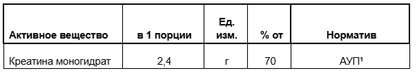 Энергетическая ценность на 100 грамм продукта: 0 кДж / 0 ккал *рекомендуемая суточная дозировка. ¹АУП - адекватный уровень потребления согласно приложению 5 «Единые санитарно-эпидемиологические и гигиенические требования к товарам, подлежащим санитарно-эпидемиологическому надзору».